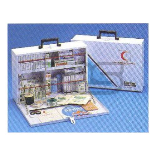 This first aid kit is designed for both factories and offices with 40 to 50 employees. Having the same high level of medicines as the Large Pack, it is equipped to meet the needs of most emergencies as well as many common ailments. This feature-packed model has a lockable drop-down lid that is held firmly by two restraining chains forming a sturdy platform which itself has additional storage pockets. In additional the medicine compartments are secured with elastic straps. Its base is also fitted with rubber studs. This model be a standard equipment at all hostels, secondary schools, colleges, universities, etc.